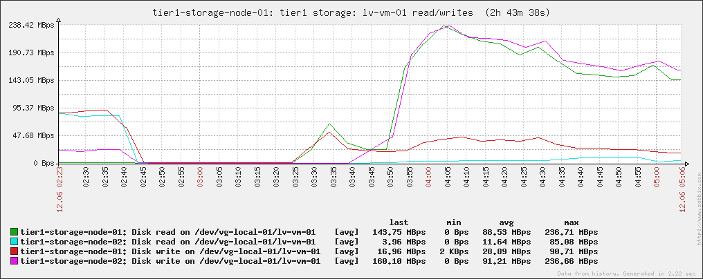 Unsere Mitarbeiter haben umgehend reagiert und die zentralen Storage Server (Tier1: SSD basiert) stehen seit 03:25 Uhr wieder zur Verfügung. Der Ausfall hat dazu geführt, dass sich die beiden Storage Server untereinander synchronisieren (abgleichen). Diese Synchronisation wiederum führt zu hohen Disk Schreib- und Lese-Zugriffen, was wiederum zu Performance Engpässen bei den virtuellen Maschinen führt.