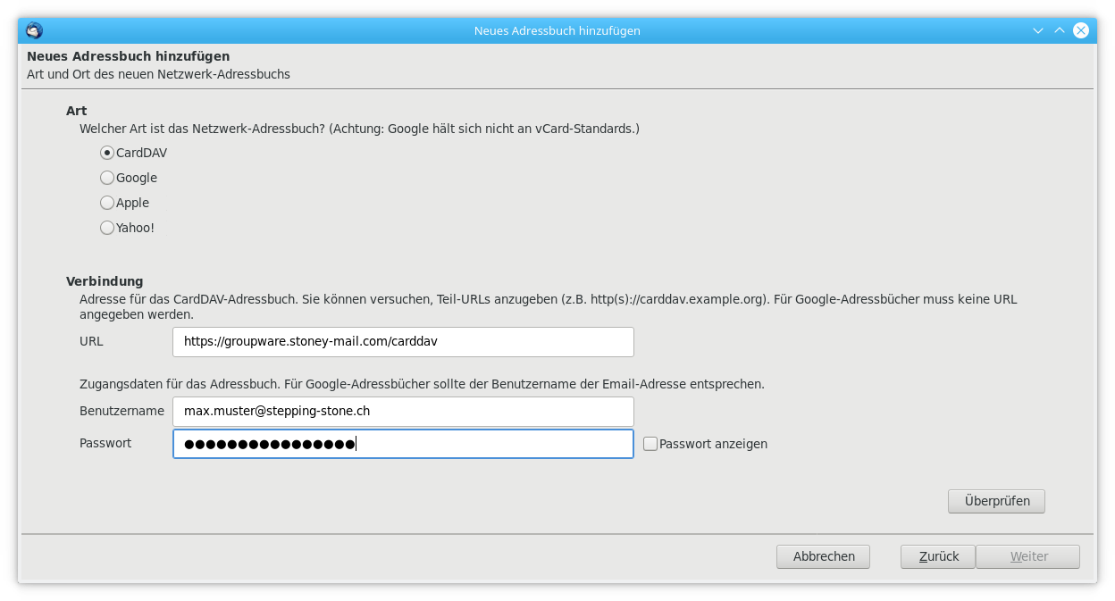Wählen Sie die Option "CardDAV" und geben Sie "/carddav" oder die cardDAV URL die Ihnen mitgeteilt worden ist ein.