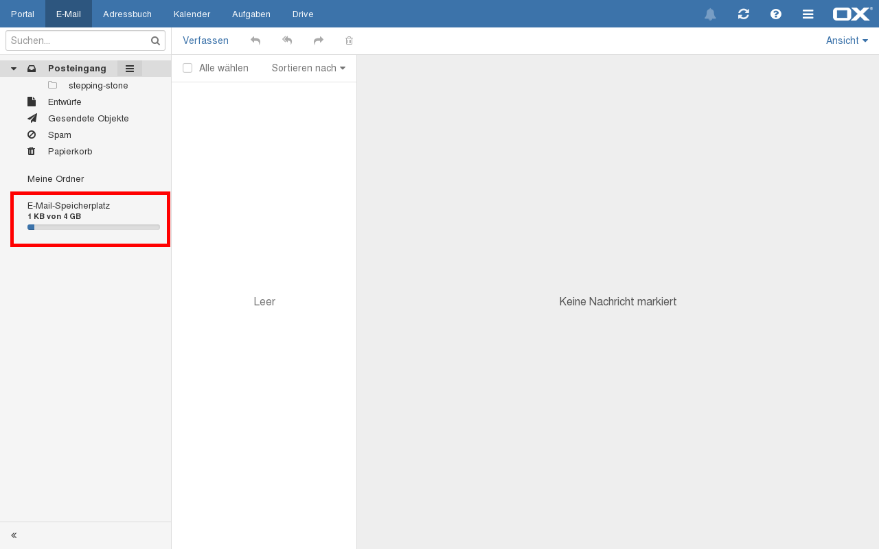 To see the actual storage of your mail box you have to log in to your online mail account. On the top right of this website you will find the login button. The available storage and how much is currently in use is found in the Mail tab.