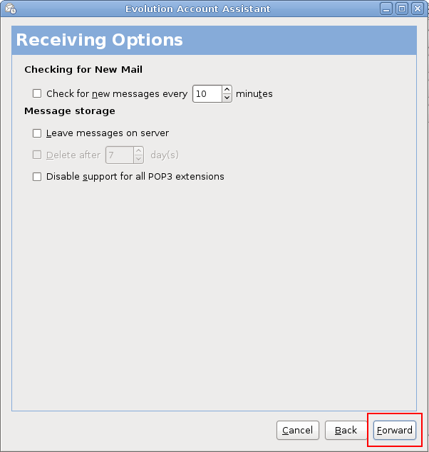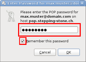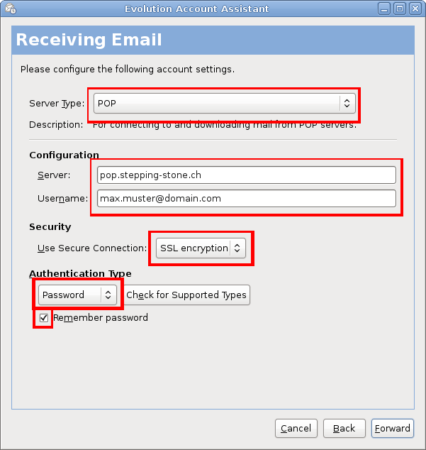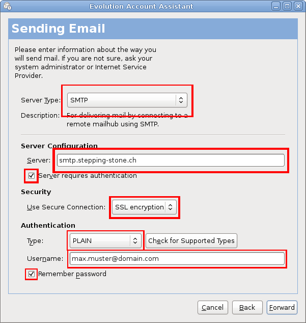 Choose "SMTP" as Server Type. At the Server Configuration type "smtp.stoney-mail.com" as Server and tick the "Server requires authentication". Choose "SSL encryption" as Secure Connection. Choose "PLAIN" as Type at the Authentication, fill in your Username (your Email Address) as Username and tick "Remember Password". Click on "Forward".