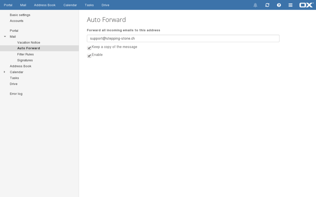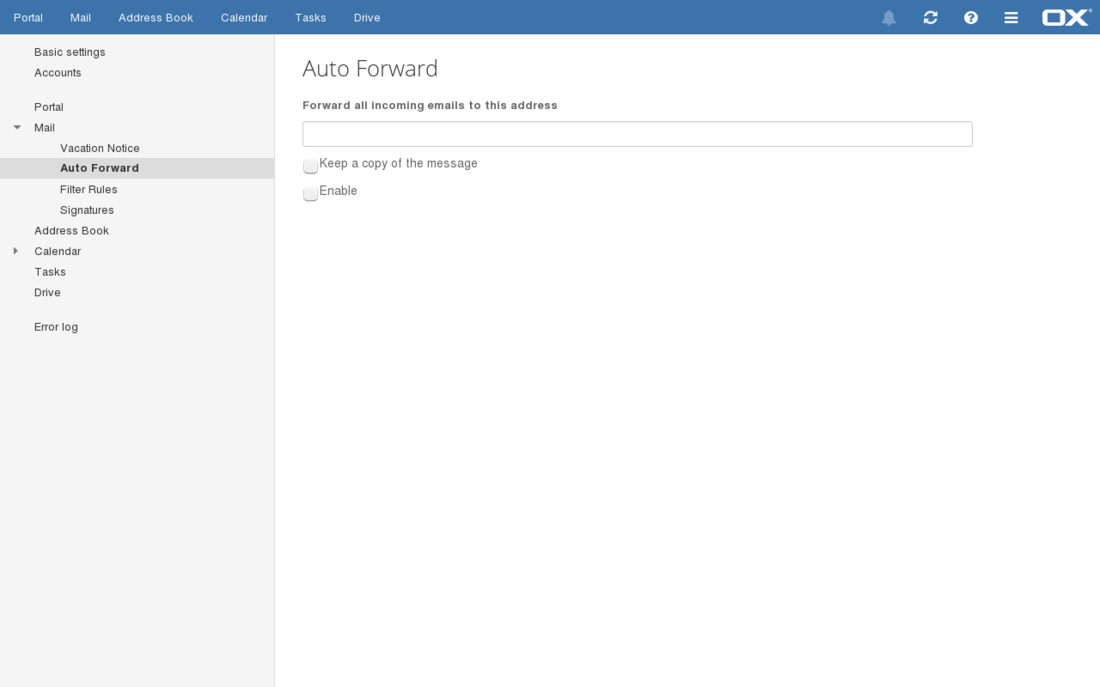 In the menu on the left hand side click on mail, followed by Auto Forward, to open the Auto Forward settings.